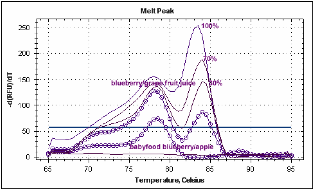 Melting peak profiles of real-time PCR carried out with blueberry juice at different percentages and blueberry-based foods with the new species-specific primer pairs.