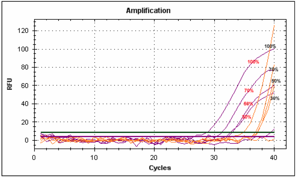 Multiplex real-time PCR carried out with dual labeled probes on DNA extracted from blueberry and orange juices mixed at different percentages.