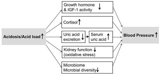 Discussed mechanisms involved in blood pressure changes due to an altered acid–base status of which particularly a potentially altered microbiome requires further experimental confirmation. IGF-1, insulin-like growth factor-1.