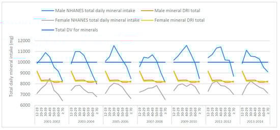 The total mean male and female daily mineral intakes (mg), from food, from NHANES data (50–59-year-old age groups from the 2007–2008 and 2013–2014 NHANES surveys) were calculated and graphed with the totals for DRIs and DVs, as shown in Figure 1. The total mineral intake inherent in the DRIs are similar for males and females except for adjustments to Ca, Mg and Zn. With a few exceptions, NHANES data (across survey years and age groups) indicates males are consuming above, whereas females are consuming below, the total daily-recommended mineral intake derived from the DRIs. This suggests that, overall; the total daily mineral intakes from food may be too high in males but too low in females.