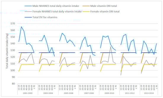 Regarding total vitamin intakes from food (Figure 2 and Table 3), males in general seem to exceed the total mineral intake suggested by the DRIs and DVs. For females, because the DRIs and DVs differ, the DRIs are exceeded in most instances while the intakes are lower than the DVs, especially the 2016 DVs. Assuming the DRIs for vitamins C, B3, E, B6, B2, B1, A, folate and vitamins K, D and B12 were ingested, males 50–59 years would be consuming approximately 127 mg of these vitamins per day, whereas females 50–59 years would be consuming approximately 109 g of the same vitamins (Table 3). If Americans adhered to the DVs for vitamins, males and females 50–59 years would be receiving approximately 127 mg per day (Table 3). NHANES summary data (from What We Eat In America []) from 2007–2008 showed that approximately 138 mg and 123 mg of vitamins were consumed by males and females, respectively, from food in one day. Daily intakes in 2013–2014 were slightly lower compared to 2007–2008 intakes at 132 mg total vitamin intake for males and 111 mg for females (Table 3). On the surface, these data show that total vitamin intakes in the US are just above the DRI and DV totals. Vitamin intakes for each of the survey years (2007–2008 and 2013–2014) are also represented as pie charts for males (Figure S3) and females (Figure S4) aged 50–59 years, as well as the DRIs and DV.