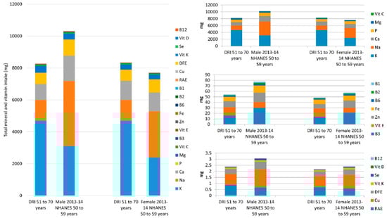 Table 5 contains the data for the minerals and vitamins combined, from food, for males and females, aged 50–59, from the same survey years. The DRIs for minerals (K, Na, Ca, P, Mg, Zn, Fe, Cu and Se) and vitamins (C, B3, E, B6, B2, B1, RAE, DFE, Vit K, D and B12) combined are 8267 mg and 8346 mg for males and females aged 51–70, respectively. The DV total for the combined vitamins and minerals discussed is 10,127 mg. NHANES data for 50–59-year old’s, from 2013–2014 show that males had a total daily mineral and vitamin intake of 10,310 mg and females had an intake of 7701 mg. This shows that in the most recent NHANES survey, males obtained more than the total DRI mineral and vitamin intake whereas females did not (Table 5 and Figure 3). Figure 3 contains all the mineral and vitamin intakes from food in a stacked column, as well as three smaller columns with nutrients segmented. The nutrients with the six largest intake values (K, Na, Ca, P, Mg and vitamin C) have a DRI (51–70 year olds) total of 8210 mg for males and 8295 mg for females, for these micronutrients, and account for over 99% of the total intake. The NHANES 2013–2014 totals were 10,229 mg and 7641 mg for males and females 50–59 years respectively, showing males intakes were above the DRI value and females below, from food. Next are the nutrients whose DRIs range from 16–1.2 mg/day (B3, Vit E, Zn, Fe, B6, B2 and B1). While these account for less than 1% of the total, the total DRI (males and females aged 51–70) for these nutrients combined are 54 mg and 49 mg respectively. However, NHANES 2013–2014 data showed that intakes were 77 mg for males aged 50–59 and 57 mg for females of the same ages, showing both males and females exceed the DRI total for these nutrients from food. The remaining micronutrients (A, Cu, DFE, K, Se, D and B12), have a total combined DRI intake of 2.4 mg for males 51–70 years and 2.2 mg for females aged 51–70, whereas NHANES intakes from 2013–2014 were 3.1 mg and 2.4 mg for males and females, aged 50–59 respectively, again showing males and females exceed the DRI total for these nutrients, from food.