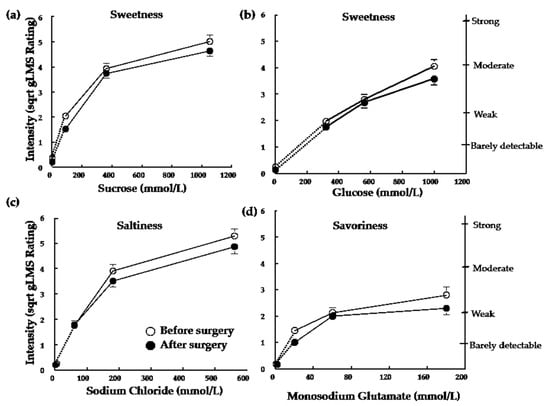 Perceived sweetness of increasing concentrations of (a) sucrose and (b) glucose, saltiness of increasing concentrations of (c) sodium chloride, and savoriness of increasing concentrations of (d) monosodium glutamate before (open symbols) and after (closed symbols) ~20% weight loss induced by bariatric surgery. Roux-en-Y Gastric Bypass and Sleeve Gastrectomy groups were combined because there was no main effect of group, nor interaction. Data are mean values ± standard error of the mean.