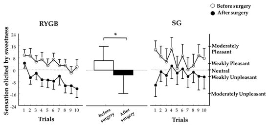 Hedonic value of sweetness when tasting an unswallowed sucrose solution across 10 trials before (open symbols, white bar) and after (closed symbols, black bar) ~20% weight loss induced by RYGB or SG. Two-way ANOVA revealed a main effect of time (before surgery vs. after surgery) (F(1,29) = 7.5 ;* p = 0.01) RYGB and SG groups were combined because there was no main effect of group, nor interaction (all p values > 0.19). The right axis (illustrated for SG only but applicable for both groups) shows descriptors visualized by subjects when using the general labeled magnitude scale (gLMS). The left axis (illustrated for RYGB only but applicable for both groups) shows numbers corresponding to those descriptors on the scale. These numbers are not seen by subjects but experimenters receive them from the computer program. Data are mean values ± standard error of the mean RYGB, Roux-en-Y Gastric Bypass; SG, Sleeve Gastrectomy.