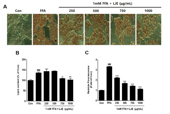 HepG2 cells were exposed to 1 mM FFA to induce hepatic steatosis, and intracellular lipid accumulation was visualized by Oil Red O staining. FFA-induced HepG2 cells showed significant increases in lipid droplets compared with the untreated BSA-control (Figure 2A,B), and hepatic steatosis was significantly inhibited by LJE at high concentrations of 750 and 1000 μg/mL (Figure 2A,B). The quantitative determination of intracellular TG content by Nile Red analysis showed a concentration-dependent decrease in the LJE-treated HepG2 cells (Figure 2C).
