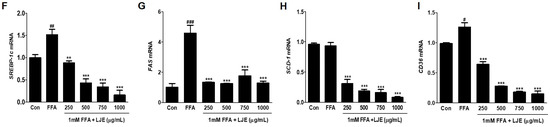 Effects of LJE on lipogenesis markers in HepG2 cells. (A–E) Immunoblot analysis; (F–I) Quantitative real-time PCR analysis. Data represent means ± SEM. # p < 0.05, ## p < 0.01, ### p < 0.001 vs. Con; ** p < 0.01, *** p < 0.001 vs. FFA.