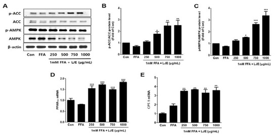 LJE significantly increased the phosphorylation of AMPK and ACC, which is the direct substrate of AMPK (Figure 4A–C). PPAR-α and CPT1 mRNA levels (related to β-oxidation) were also significantly increased by LJE treatment in FFA-induced HepG2 cells (Figure 4D,E).