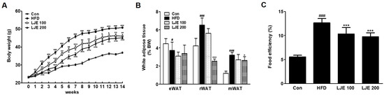 Effects of LJE on the body weight and visceral white adipose tissues in high-fat diet (HFD)-fed mice. (A) Body weight changes; (B) Visceral white adipose tissue; (C) Food efficiency. Con, normal control diet; HFD, high-fat diet; LJE 100, HFD plus LJE (100 mg/kg, peroral); LJE 200, HFD plus LJE (200 mg/kg, peroral). Data represent means ± SEM (n = 8). # p < 0.05, ## p < 0.01, ### p < 0.001 vs. Con; * p < 0.05, ** p < 0.01, *** p < 0.001 vs. HFD.