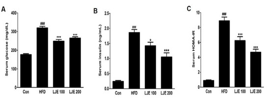 Effects of LJE on serum glucose, insulin, and homeostasis model assessment-insulin resistance (HOMA-IR) in HFD-fed mice. (A) Serum glucose levels; (B) Serum insulin levels; (C) Serum HOMA-IR. Con, normal control diet; HFD, high-fat diet; LJE 100, HFD plus LJE (100 mg/kg, peroral); LJE 200, HFD plus LJE (200 mg/kg, peroral). HOMA-IR, homeostasis model assessment values for insulin resistance. Data represent means ± SEM (n = 8). ### p < 0.001 vs. Con; * p < 0.05, *** p < 0.001 vs. HFD.