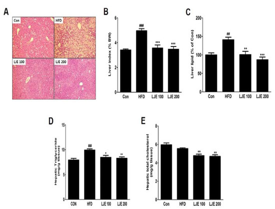 Effects of LJE on liver steatosis in HFD-fed mice. (A) Liver sections stained with hematoxylin and eosin (100×); (B) Liver index; (C) Liver lipid content; (D) Hepatic triglyceride levels; (E) Hepatic total cholesterol levels. Con, normal control diet; HFD, high-fat diet; LJE 100, HFD plus LJE (100 mg/kg, peroral); LJE 200, HFD plus LJE (200 mg/kg, peroral). Data represent means ± SEM (n = 8). ## p < 0.01, ### p < 0.001 vs. Con; * p < 0.05, ** p < 0.01, *** p < 0.001 vs. HFD.