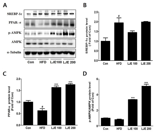 Effects of LJE on hepatic lipid metabolism in HFD-fed mice. (A-D) SREBP-1, PPAR-α, and phosphorylated AMPK protein levels by immunoblot analysis. Con, normal control diet; HFD, high-fat diet; LJE 100, HFD plus LJE (100 mg/kg, peroral); LJE 200, HFD plus LJE (200 mg/kg, peroral). Data represent means ± SEM (n = 8). # p < 0.05 vs. Con; *** p < 0.001 vs. HFD.