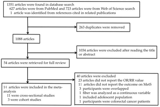Studies were selected based on the following criteria: (1) The study design was cross-sectional, case-control, or cohort; (2) the exposure of interest was dietary fiber intake; (3) the outcome of interest was MetS; (4) age of the participants was ≥18 years; and (5) odds ratio (OR) or relative risk (RR) with corresponding 95% confidence interval (CI) for the highest versus the lowest dietary fiber intake related to MetS were available. Studies in which all participants were adolescents or patients with cancer were excluded. When one population was reported in several publications, the publications with smaller sample size were excluded to avoid data duplication.