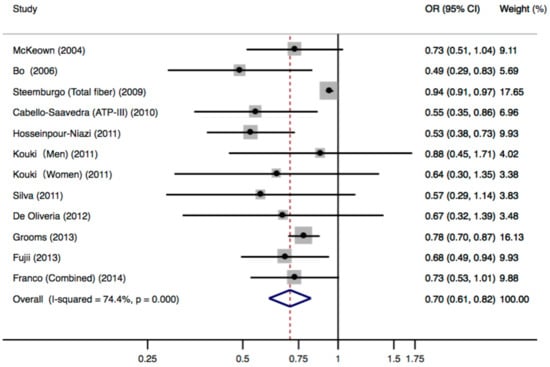 Figure 2 shows the multivariable-adjusted ORs for individual studies and all studies combined for the highest versus lowest categories of dietary fiber intake. The meta-analysis of all cross-sectional studies showed that subjects in the highest category of dietary fiber intake had a significantly decreased risk for MetS, compared with those in the lowest category. The pooled OR was 0.70 (95% CI: 0.61–0.82) and high heterogeneity was observed (p < 0.001, I2 = 74.4%). Two risk estimates were available in the study of Cabello-Saavedra et al. [] based on different MetS diagnostic criteria. When the estimate based on the IDF criteria was included in the analysis, the pooled OR was 0.71 (95% CI: 0.61–0.83), with similarly high heterogeneity (p < 0.001, I2 = 73.4%).