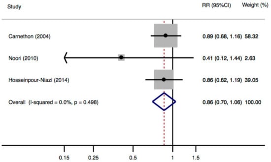 Sensitivity analysis was performed to investigate the source of heterogeneity. After removing four studies [,,,], heterogeneity significantly decreased (p = 0.181, I2 = 32.4%), and the pooled OR was 0.67 (95% CI: 0.58–0.78), suggesting that the heterogeneity could be attributed to the four studies removed. When comparing with the subjects in other studies, the four studies have included heterogeneous subjects, such as T2DM patients [,,] and elderly population [].