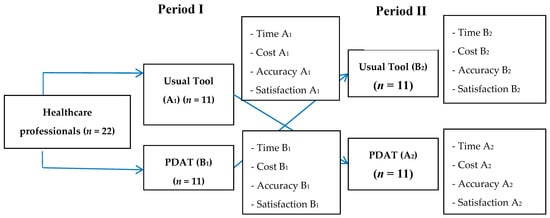 As shown in Figure 1, healthcare staff were divided randomly into two groups. In the first period, the first group used the usual tool (modified Comstock) and the second group used PDAT for two weeks. In the second period, the first group used PDAT and the second group used modified Comstock for two weeks. The sample size calculation for comparing means of two groups indicated that a minimum sample size of 10 assessors was required to detect a mean difference in accuracy between the test method and reference method of 13 kcal (given a standard deviation (SD) of the difference between the two value of 10 kcal) [] with 90% power and a type I error probability of ≤0.05. Each staff member measured three patients for two periods, so that a total of 132 patients were included.
