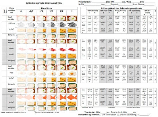 Visual estimation of dietary intake was first reported by Comstock, St. Pierre, and Mackierman (1981) [] in a study that involved estimation of school meals consumption comparing children’s self-reports and the weighed method by trained observers. Since this report, several studies have conducted some quantitative validation tests of the visual estimation method in various food service settings, including hospitals [,,,,,]. Although there are some validation studies to record food intake in clinical settings, studies reporting the validity of estimating semisolid or amorphous food items are scarce [,]. In addition, developing and validating food recording methods that are country-specific, particularly in Asian countries, which have different food textures and characteristics, is essential []. The modified Visual Comstock Scale has been a preferred method for estimating patient food waste in Indonesian hospitals; however, this method requires skilled staff, routine training and support, and also tends to overestimate food intake []. Such overestimation can allow problems to go unrecognized by nursing staff, thus preventing follow-ups with further nutritional assessment [,]. We have successfully developed and validated a dietary assessment tool for use in a clinical setting, the Pictorial Dietary Assessment Tool (PDAT) []. This method is a simple, easy-to-use, quick tool that enables staff to estimate dietary intake and can easily be integrated into dietitians’ evaluations of patients during their stay in the hospital. PDAT provides a ready reckoner of energy and protein content of meals that facilitates the nutrient intake estimation without the need for detailed mathematical computation. There were no differences in macronutrient intake estimation across different backgrounds of healthcare staff [].