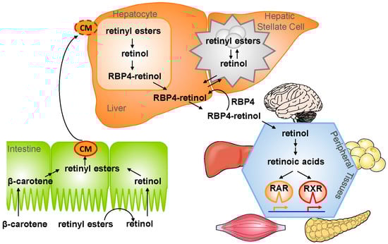 Schematic representation of intestinal vitamin A absorption, transport to, and storage in the liver and redistribution to peripheral tissues (see main text for details). Carotenes (from plants) and retinyl esters (from animals) are the main dietary sources of vitamin A (lower left corner). They are absorbed in the proximal small intestine and transported as retinyl esters in chylomicrons (CM) to the liver. Chylomicron remnants are taken up by hepatocytes and retinyl esters are hydrolyzed to form retinol. Hepatocytes produce retinol binding protein 4 (RBP4) and retinol binding to RBP4 stimulates the secretion of retinol-carrying holo-RBP4 to the circulation. Retinol is then either transported to hepatic stellate cells for storage as retinyl esters or transported to peripheral tissues where it is converted to retinoic acids that activate the transcription factors retinoic acid receptor (RAR) or retinoid X receptor (RXR). In times of inadequate vitamin A intake, retinol is released from the HSC stores to maintain stable levels of circulating retinol (~2 μM in human).