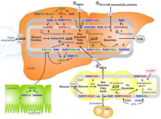 Hepatic lipid content is a result of the following steps: (1) de novo lipogenesis (DNL) in the liver; (2) an influx of dietary lipids (delivered as non-esterified free fatty acids (NEFAs) or as TG in chylomicrons); (3) an influx of NEFAs produced by adipose tissue (primarily from white adipose tissue (WAT)); (4) the esterification of lipids (mainly to TG) and packaging into lipid droplets; (5) an influx of TG carried in CM remnants and low density lipoproteins (LDL); (6) an efflux of TG carried in very low density lipoprotein (VLDL)-particles; (7) TG hydrolysis producing NEFAs; and (8) catabolism of NEFAs through mitochondrial and peroxisomal β-oxidation (Figure 2). NAFLD is characterized by hepatic TG accumulation, enhanced VLDL production, and secretion leading to hypertriglyceridemia. Vitamin A metabolites, especially retinoic acids, are involved in regulatory networks that affect all these processes either directly or indirectly, as described below and schematically depicted in Figure 2.