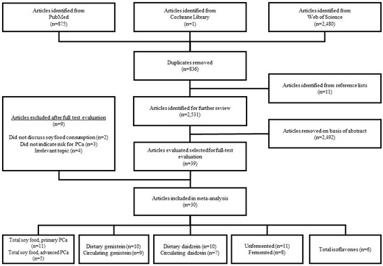 In total, 3356 articles were identified from the library search engines. After removing duplicates and adding articles identified from reference lists, 2531 articles remained. Of the 2531 articles that were screened by abstract, 39 articles were found to contain potentially relevant information and were evaluated by full text review. Upon reviewing the full text articles for the aforementioned inclusion criteria, 30 articles were included in the final analysis [27,28,29,30,31,32,33,34,35,36,37,38,39,40,41,42,43,44,45,46,47,48,49,50,51,52,53,54,55,56]. Of these 30 articles, 24 [27,28,29,30,31,32,33,34,36,37,38,39,40,41,42,43,45,46,47,48,49,52,53,55] included information regarding dietary soy intake and nine [29,35,40,42,44,50,51,54,56] included information regarding circulating isoflavone levels (Figure 1).