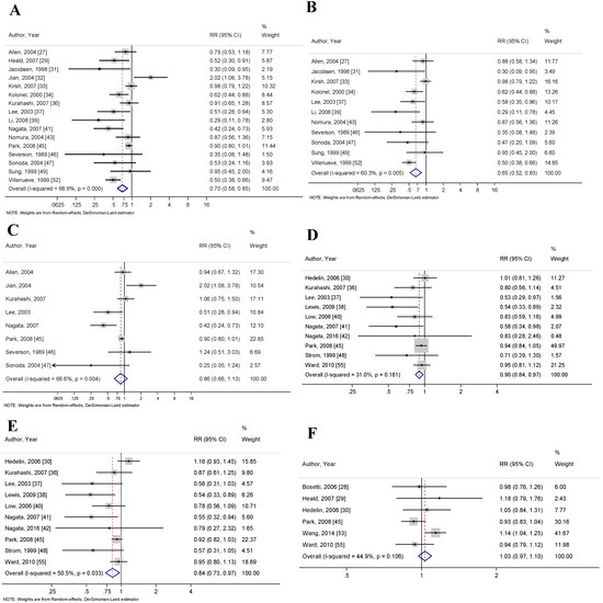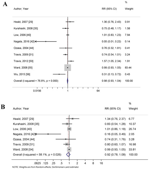 STATA/IC version 14.2 (StataCorp LP, College Station, TX, USA) was used to analyze the data. Because OR is nearly equivalent to RR when considering low incidence of diseases [19], RR and 95% confidence intervals (CI) were used as a measure of the effect size for all included studies. Heterogeneity amongst studies was determined using the I2 statistic [20]. Fixed and random (DerSimonian–Laird) effects models were used, depending on the I2 result, as markers of study heterogeneity [20]. An I2 value of less than 50% (I2 < 50%) signified low-to-moderate heterogeneity between studies, so a fixed effect model was used to determine RR estimates. An I2 value of greater than or equal to 50% (I2 ≥ 50%) signified moderate-to-substantial heterogeneity between studies, so a random effects model was used to determine RR estimates. When results from fixed and random effects models were conflicting and studies showed moderate heterogeneity (I2 = 30–60%), we presented the latter as it represents a more conservative approach [21,22].