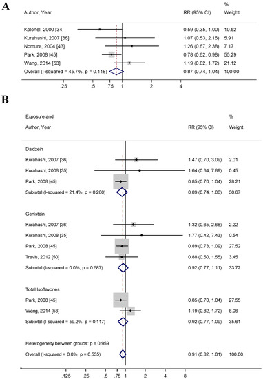 Seven [34,35,36,43,45,50,53] studies reported the risk of advanced PCa with soy intake and circulating isoflavone levels. Of these seven studies, four [34,43,45,53] studies were conducted in North America, two [35,36] studies were conducted in Asia, and one [50] study was conducted in Europe. Only one [34] was a case-control study, two [35,50] were NCC studies, and four [36,43,45,53] were cohort studies. Five [34,36,43,45,53] studies reported a risk of advanced PCa with dietary soy food intake and two [35,50] studies reported a risk of advanced PCa with circulating isoflavones. For studies that reported dietary soy food intake, the pooled RR was 0.87 (95% CI: 0.74–1.06, p = 0.119) (Figure 4A). Neither Begg’s correlation test (p = 1.00) nor Egger’s linear regression test (p = 0.548) for bias were significant. The I2 index showed moderate heterogeneity between studies (45.7%). Funnel plots, used to explore publication bias, are shown in Appendix A (Figure A4).