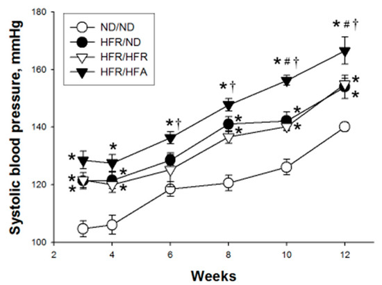 Effect of maternal and post-weaning high-fructose (HFR) and post-weaning high-fat (HFA) intake on systolic blood pressure in 12-week-old male offspring. * p < 0.05 vs. ND/ND; # p < 0.05 vs. HFR/ND; † p < 0.05 vs. HFR/HFR.