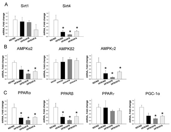 Effect of maternal and post-weaning high-fructose (HFR) and post-weaning high-fat (HFA) intake on mRNA expression of (A) silent information regulator transcript 1 (SIRT1) and 4 (SIRT4); (B) AMP-activated protein kinase (AMPK) α-, β-, and γ-subunits; and (C) peroxisome proliferator-activated receptor (PPAR) α-, β-, and γ-isoforms and PPARγ coactivator-1α (PGC-1α) in male offspring kidneys at 12 weeks of age. n = 8/group. * p < 0.05 vs. ND/ND.