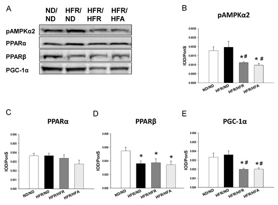 (A) Representative Western blots and relative abundance of (B) phosphor-AMPKα2 (63 kDa); (C) PPARα (52 kDa); (D) PPARβ (52 kDa); and (E) PGC-1α (90 kDa) in offspring kidneys at 12 weeks of age. n = 8/group. * p < 0.05 versus ND/ND; # p < 0.05 versus HFR/ND.