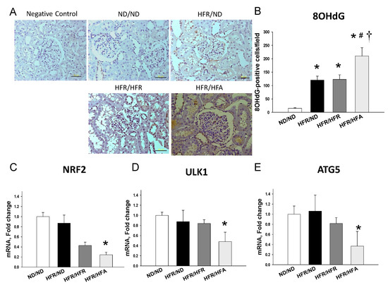 (A) Light micrographs illustrating immunostaining for 8-hydroxydeoxyguanosine (8-OHdG) in the kidney in male offspring at 12 weeks of age. Bar = 50 μm; (B) quantitative analysis of 8-OHdG-positive cells per microscopic field (400×); Effect of maternal and post-weaning high-fructose (HFR) and post-weaning high-fat (HFA) intake on mRNA expression of (C) Nfr2, (D) Ulk1, and (E) Atg5 in male offspring kidneys at 12 weeks of age. n = 8/group. * p < 0.05 vs. ND/ND; # p < 0.05 vs. HFR/ND; † p < 0.05 vs. HFR/HFR.