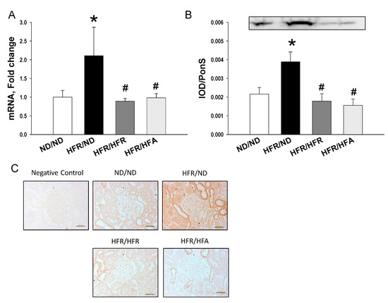 Litter sizes were not significantly altered by high-fructose exposure of the maternal rat (pups per litter: ND group = 14 ± 0.8; HFR group = 15.5 ± 0.8). The mortality rate of male pups was not different among the four groups. As shown in Table 3, the HFR/HFR group had lower body weights compared with the other three groups. The kidney weights were lower in the HFR/ND and HFR/HFA groups vs. ND/ND group. The kidney weight-to-body weight ratios were highest in the HFR/HFR group, indicating post-weaning HFR, but not HFA, increases the vulnerability to develop renal hypertrophy (expressed as an increased tissue weight to body weight ratio) in offspring exposed to maternal HFR diet. However, plasma creatinine level was not different among the four groups.