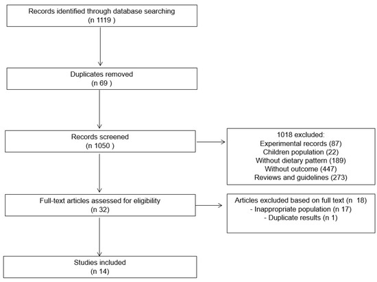 A total of 1119 studies were found, and after removal of the duplicates, 1050 were screened by title and abstract. After reading the titles and abstracts, only 14 studies were included in the systematic review (Table 1). The agreement between the reviewers was substantial: κ = 0.625 (p = 0.02).