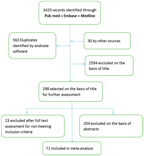 A total of 3425 observational studies were identified electronically from Pubmed, Embase and Medline. Thirty records were identified by other sources. The references were screened for duplication using endnote software and 563 references were removed. The titles were screened in the first round of selection, where 298 articles were selected for abstract assessment. Out of these 298 articles, 94 were eligible for full text assessment and systematically assessed for inclusion. Twenty-three studies did not meet the inclusion criteria or lacked the sufficient data reporting, thus were excluded. Seventy-one studies met the inclusion criteria and were used for the meta-analysis (Figure 1).