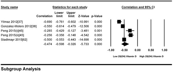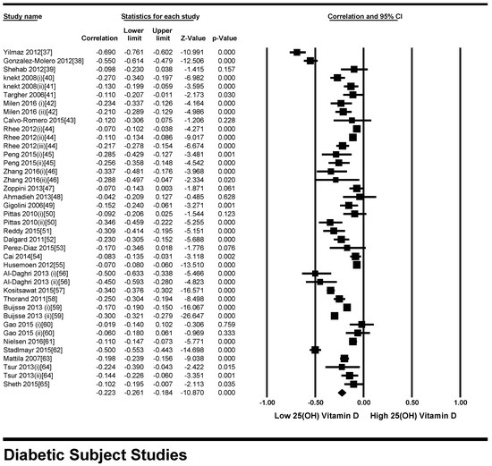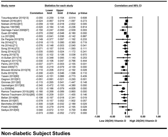 Four studies were excluded because their study plan was not in line with our study plan [15,16,17,18,19]. Ten studies [20,21,22,23,24,25,26,27] were excluded because the data were not compatible to calculate correlation coefficient. Five studies [28,29,30,31,32,33] were excluded because the parameters were calculated for mixed population (healthy and type 2 diabetes patients). Two studies were excluded because the number of participants in each vitamin D Quintile had not been mentioned [34,35]. One study [36] was excluded because it was only an abstract from a conference presentation. We excluded all interventional studies with vitamin D supplementation, but the possibility of individual vitamin D intake cannot be ruled out in the included studies.