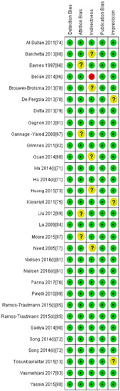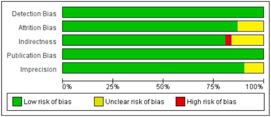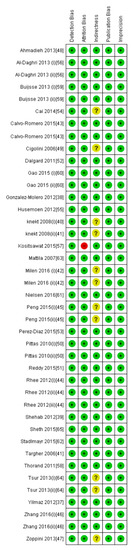 - Higgins, J.P.T.; Thompson, S.G.; Deeks, J.J.; Altman, D.G. Measuring inconsistency in meta-analyses. BMJ 2003, 327, 557–560. [Google Scholar] [CrossRef] [PubMed]