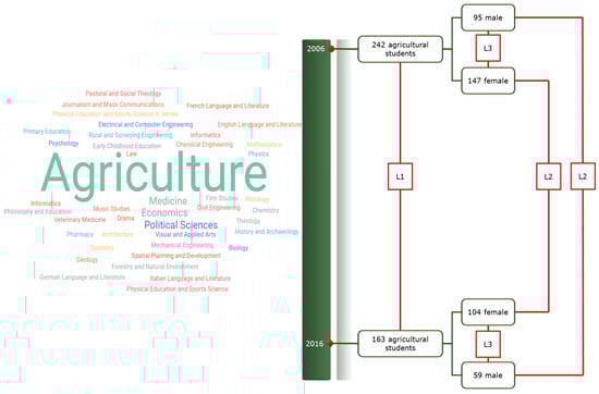 Participants’ characteristics according to gender and year are depicted in Figure 2. Between year–within gender comparisons (L2) demonstrated (i) a statistically significant increase in the predominance of normal-weight individuals among female students (75.5% vs. 86.5%) and (ii) a significant decrease in the prevalence of underweight only among females (16.3% vs. 3.8%). When within year–between gender comparisons of BMI category were conducted (L3), several statistically significant differences were also unveiled. In 2006, females were more likely to be either underweight (16.3% vs. 3.2%) or of normal weight (75.5% vs. 54.7%) compared to male students. Moreover, males were almost seven times more likely to be overweight (41.1%) compared to females (6.1%). Similar trends, concerning only normal and overweight BMI category, were also observed for participants in 2016 (Figure 2). However, in case of overweight BMI category, the observed between gender–within year differences were less pronounced, as males were almost three times more likely to be overweight (28.8%) compared to females (8.7%).