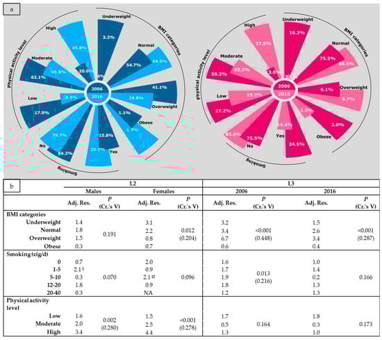 Distribution (a) and comparisons (b) of participant’s characteristics according to gender and year. BMI: Body Mass Index; L2: between year–within gender comparisons; L3: between gender–within year comparisons; Adj. Res.: Adjusted Residual (in absolute value); P: Chi square test p-value; Cr.’s V: Cramer’s V coefficient; ‡ Exact probability p-value = 0.033; ‡‡ Exact probability p-value = 0.032.