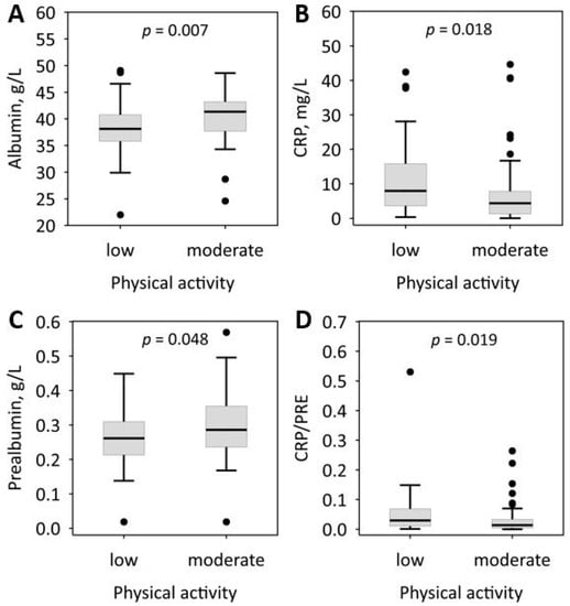 Associations between the level of physical activity reported by patients and the selected markers of malnutrition and inflammation: albumin (A); C-reactive protein (CRP) (B); prealbumin (C); and C-reactive protein to prealbumin ratio (CRP/PRE) (D). Data are shown as median, lower-upper quartile (box), non-outlier range (whiskers), and outliers (dots).