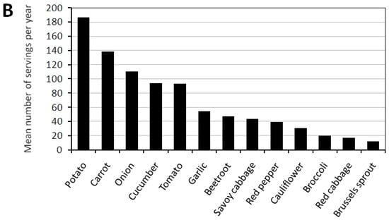 Inverse correlation was observed between the intake of exogenous antioxidants in the diet and the concentrations of uric acid (R = −0.36; p < 0.001) and serum albumin (R = −0.22; p = 0.036). Neither the selected vegetables nor fruit had a high antioxidant capacity. The most frequently chosen vegetables were: potato, carrot, onion; the most chosen fruits were: apple, lemon, and mandarin (Figure 3).