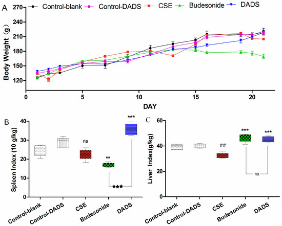 Effect of diallyl disulfide (DADS) on body weight (A); spleen index (B) and liver index (C) of rats in all groups. Rats (six animals per group) were treated by intraperitoneal injection as follows: cigarette smoke extract (CSE) group (1 mL CSE- phosphate buffer solution on days 1, 8, and 15), DADS group (100 mg/kg/day DADS + CSE), budesonide group (10 mg/kg/day budesonide + CSE), blank control group (the vehicle), and DADS control group (100 mg/kg/day DADS). (A) Rat body weights were measured in each group at the indicated time point; (B) The spleen index of rats in each group is indicated. Weight (spleen) g × 10/Weight (body) kg; (C) The liver index of rats in each group is indicated. Weight (spleen) g/Weight (body) kg. Data are presented as mean ± standard error of the mean (SEM) (n = 6/group). ## p < 0.01 vs. the blank control group. ** p < 0.01 and *** p < 0.001 vs. the CSE group. ★★★ p < 0.001 vs. the budesonide group. ns not significantly p > 0.05.