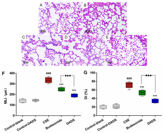 The MLI and DI were significantly increased in the CSE group, while being decreased in the DADS and budesonide groups compared to the blank control group (p < 0.001). A significantly lower value of MLI and DI was observed in the DADS group than that in the budesonide group (p < 0.001) (Figure 2F,G). In addition, the difference of MDI and DI between the blank and DADS control groups was not statistically significant (p > 0.05).