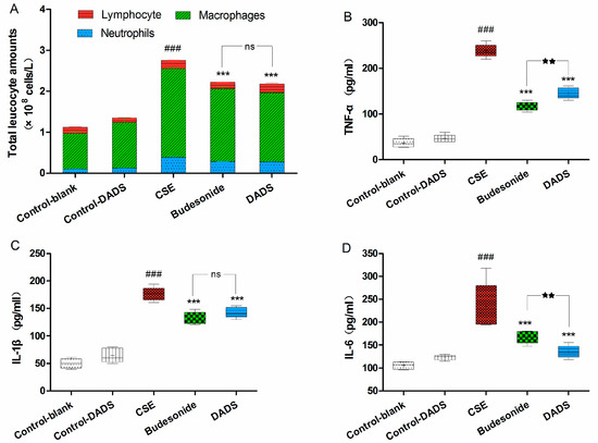 Macrophages, neutrophils, and lymphocytes are the main players in chronic immune inflammation in COPD. Exposure to CSE may induce prolonged airway inflammation relevant to the cellular infiltration of macrophages and neutrophils [31]. Therefore, we determined the number of total white blood cells as well as the differential count of neutrophils, macrophages and lymphocytes present in the BALF. There was no difference in BALF recovery volume among all groups. As shown in Figure 3A, a significant, nearly three-fold increase in the total white blood cell numbers in the BALF of the CSE group was observed compared to the blank control group (p < 0.001) As expected, the total number was markedly reduced in the BALF of rats from the budesonide and DADS groups (p < 0.001). Moreover, the differential count of neutrophils, macrophages, and lymphocytes in the BALF of the CSE group showed that CSE caused an obviously increased accumulation of neutrophils and macrophages, whereas there was a decrease in lymphocytes in the BALF. In addition, the macrophage and neutrophil counts of the DADS and budesonide groups were markedly reduced compared to the CSE group, although remaining obviously increased relative to the blank control group. However, there were no significant differences between the DADS and budesonide groups (p > 0.05). Furthermore, the total white blood cells, neutrophils, macrophages and lymphocytes between the blank and DADS control groups were not statistically significant (p > 0.05).