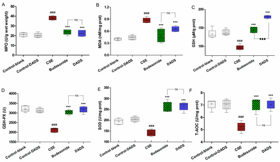 Effect of DADS on the oxidative stress markers and antioxidants in lung homogenate. Levels of myeloperoxidase (MPO) (A); Malondialdehyde (MDA) (B); Glutathione (GSH) (C); glutathione peroxidase (GSH-PX) (D); Superoxide dismutase (SOD) (E) and Total antioxidant capacity (T-AOC) (F). Data are expressed as mean ± SEM, n = 6 rats per group. ### p < 0.001 vs. the blank control group; *** p < 0.001 vs. the CSE group; ★★★ p < 0.001 vs. the budesonide group; ns not significantly p > 0.05.