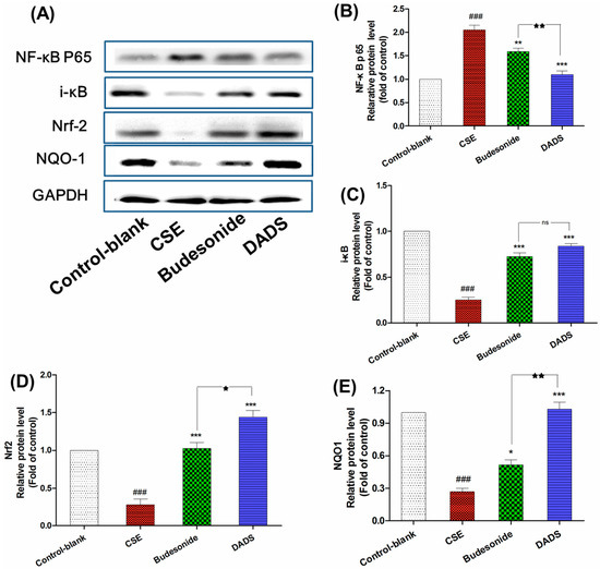 The effect of DADS on the protein expression of nuclear factor kappa B p65 (NF-κB p65), i-κB, nuclear factor erythroid 2-related factor 2 (Nrf-2), and NAD(P)H: quinone oxidoreductase 1 (NQO1) (A) Western blotting analyses of NF-κB p65, i-κB, Nrf-2, and NQO1 proteins; quantitative densitometric analyses of (B) NF-κB p65; (C) i-κB; (D) Nrf-2; and (E) NQO1 proteins normalized against glyceraldehyde-3-phosphate dehydrogenase (GAPDH). Each value represents the mean ± SEM of three independent experiments. ### p < 0.001 vs. the blank control group; * p < 0.05; ** p < 0.01 and *** p < 0.001 vs. the CSE group; ★ p < 0.05 and ★★ p < 0.01 vs. the budesonide group; ns not significantly p > 0.05.