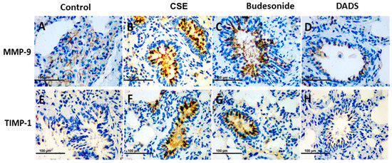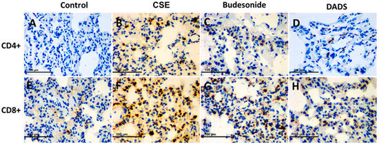 It is known that MMP-9 and its inhibitor TIMP-1 play a central role in lung remodeling in COPD [34]. On the other hand, tobacco smoking stimulates the migration of CD4+ and CD8+ T cells into the damaged tissue and promotes the destruction of lung tissue [35,36]. The potential effect of DADS on MMP-9, TIMP-1, CD4+ and CD8+ T cells in lung tissue was investigated using immunohistochemical staining. All immunohistochemical staining lung tissue slices were observed under a light microscope (400×). Briefly, the accumulation of MMP-9 and TIMP-1 was significantly greater in the CSE group than the blank control group, while DADS showed an effective suppression of the expression. Furthermore, the inhibition effect of DADS was much stronger than that of budesonide (Figure 6).