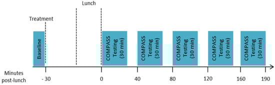 Participants then performed the baseline assessment (10 min), which comprised one completion of immediate word recall, simple reaction time (SRT), digit vigilance, choice reaction time (CRT) and visual analogue mood scales (VAS). Participants then took their allotted treatment and had a 30-min break before commencing their lunch. Lunch consisted of 4 sweet waffles with 2 tablespoons of pure maple syrup (containing 50 g of carbohydrates as starch and sugar) and 250 mL of water to drink (ad libitum water consumption was also permitted). Participants were given 20 min to eat and were encouraged to eat all of the food provided if possible. All participants conformed to this request. Immediately following lunch their first post-dose assessment commenced, this was identical to the baseline but involved 3 repetitions of the attention tasks (SRT, digit vigilance and CRT) in succession preceded by one repetition of immediate word recall and followed by one completion of the VAS (~30 min). Further identical assessments commenced at 40, 80, 120 and 160 min post-lunch, with ~10-min breaks between each assessment. Assessments were conducted between 0 and 190 min post-meal on the basis of previous data showing reductions in insulin levels across a 180 min post-prandial period following the same seaweed extract []. The timings of assessments within that period were dictated by the length of the assessment and the allowance of a short rest between assessments. The structure of the testing session is shown in Figure 1.