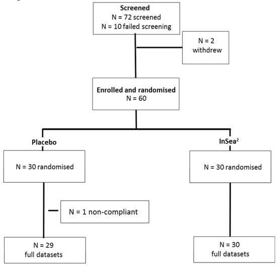 Prior to participation, volunteers were required to provide informed consent. Non-smokers who self-reported that they were in good health, with no pre-existing medical condition or illness, for whom English was their first language and with a BMI > 18.5 and <30 km/m2 were recruited to take part. Given the potential impact on cognition or the possibility of interaction with the study intervention, volunteers confirmed that they were not habitually taking any dietary/herbal supplements or medication (excluding the contraceptive pill). Participants did not consume caffeine excessively (determined as >500 mg per day, assessed by caffeine consumption questionnaire) and did not have a history of/current diagnosis of drug or alcohol abuse (self-report). They confirmed that they did not have a history (or current incidence) of head trauma, learning difficulties, attention deficit hyperactivity disorder (ADHD), or dyslexia; they did not suffer from frequent migraines (more than once per month) or have a visual impairment that could not be corrected with glasses/contacts. They also confirmed that they were not pregnant, seeking to become pregnant or lactating. Volunteers with a history of intestinal tract surgery, or any food intolerances/sensitivities, including seafood/fish allergies were also excluded from participation.