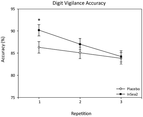 A significant treatment × repetition interaction was observed for digit vigilance accuracy (F(2, 552.240) = 3.377, p = 0.035). Pairwise comparisons revealed that those receiving brown seaweed were significantly more accurate than placebo, equating to ~4%, during repetition 1 of the assessments (p = 0.039). See Figure 3. There were no other significant effects on digit vigilance accuracy and no significant effects on digit vigilance reaction time.
