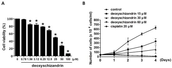 Cell viability was determined using MTT assay. First, the cells were seeded in each well containing 50 µL of RPMI medium in 96-well plates. After 24 h, various concentrations of deoxyschizandrin were added. After 48 h, 25 µL of MTT (5 mg/mL stock solution) was added, and then the plates were incubated for an additional 4 h. The medium was discarded and the formazan crystals that formed in the cells were dissolved in 50 µL of dimethyl sulfoxide (DMSO). The optical density was measured at 540 nm using a SpectraMax (Molecular Devices, Sunnyvale, CA, USA). Each assay was performed in duplicate or triplicate.