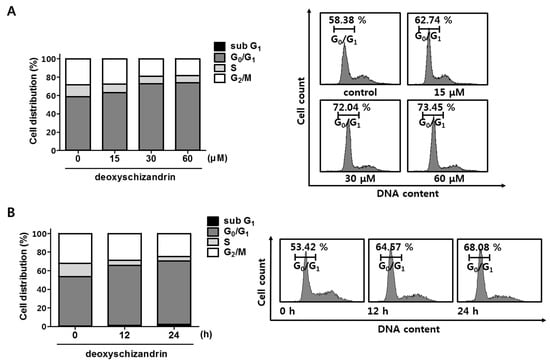 Effect of deoxyschizandrin on cell cycle in A2780 cells: (A) Cell cycle analysis was performed using propidium iodide (PI) staining assay. A2780 cells were treated with the indicated concentration of deoxyschizandrin (15, 30, and 60 µM) for 48 h and then stained with propidium iodide (PI). The cell cycle distribution profiles of the cells were determined by flow cytometry (FACS); (B) Distribution of cell number in cell cycle was measured at 12 and 24 h after deoxyschizandrin (30 µM) treatment.