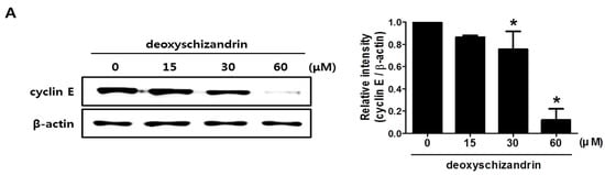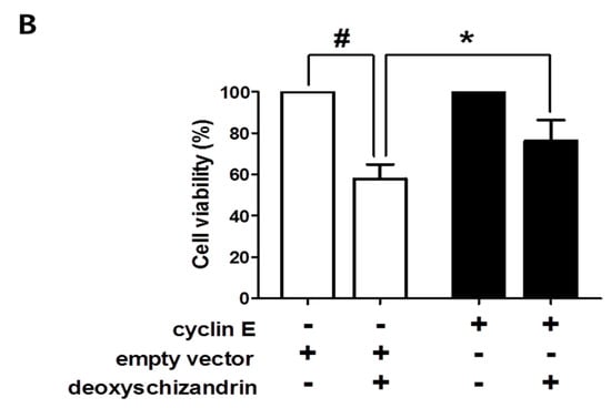 Involvement of cyclin E in deoxyschizandrin-induced cell cycle arrest in A2780 cells: (A) Effect of deoxyschizandrin on cyclin E expression was measured using Western blotting. A2780 cells were treated with the indicated concentration of deoxyschizandrin (15, 30, and 60 µM) for 48 h. β-Actin was used as an internal control. Band images are representatives of three individual experiments and the results of densitometric analysis represent the mean ± SD of three independent experiments. * p < 0.05 vs. the control group; (B) Involvement of cyclin E in deoxyschizandrin-induced cell cycle arrest was examined using MTT assay. A2780 cells were transfected with cyclin E expression vector and were treated with deoxyschizandrin (30 µM) for 48 h. The values represent the mean ± SD of results from three independent experiments. # p < 0.05 vs. the control group; * p < 0.05 vs. the treated group transfected with empty vector.
